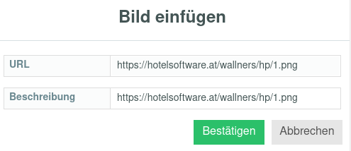 Es erscheint daraufhin ein Dialog mit "Bild einfügen" als Überschrift und zwei Feldern: URL und Beschreibung.